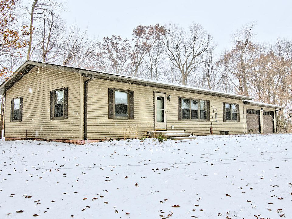 Country Ranch: 2.1 Acre, 3 bedroom, 2.5 bath, First Floor Laundry, 2+ Car Garage, Finished LL Rec Room, Freshly Painted Through-out, Move-in Pristine Condition. Open Kitchen and dining have updated vinyl flooring, sliding glass patio door, built-in dishwasher, pull-outs, stainless steel refrigerator, snack counter and stools. Laundry closet down the hall leading to 2+ garage having wide stairs to basement. Main level features living room with newer carpeting leading to large MBR suite with walk-in-closet and full bath. Home is split design with 2 additional bedrooms and full bath. Lower level rec room has wet bar with refrigerator, 1/2 bath and free-standing gas fireplace. Lots of space for entertaining. Trees and wildlife abound. Listen for the quiet.