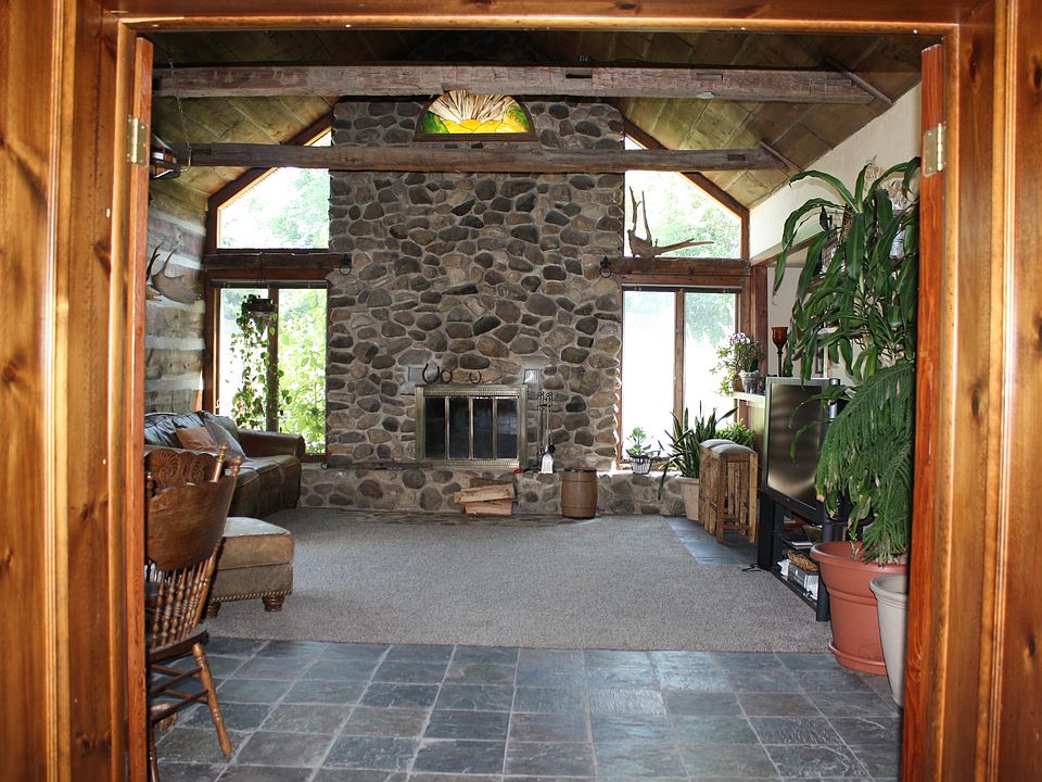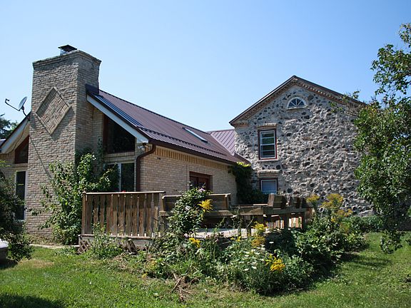Beautifully Restored & Updated Stone & Brick Home on 6 Acres. New Steel Roof 11/2014, Flooring, & Baths 2014 too. Great room addition with floor to vaulted ceiling natural stone fireplace w/hand crafted stain glass light. Beautiful big beams, sidewalls with barn wood, custom skip trolled drywall, Slate flooring, and granite tiled bar to take it all in. Quite a Wow room. Family room with Brick natural fireplace, and original wood flooring. Country Kitchen with tons of cabinetry, and granite counter tops. Main floor master, with master bath that has been remodeled with a tiled shower, and flooring. Updated upper full bath with tiled surround tub, vanity top, & flooring. Main floor large laundry room, with a big pantry. Private backyard with a Two Tier Deck, and a large fenced in yard. This 6 Acre property offers tall mature Pine trees, Fruit trees, Hardwoods, variety of Perennials, established Concord Grapes, and acreage that seller allows local farmer to farm (verbal agreement, year to year approximately 4 acres) . Property is zoned Rural District which allows up to 5 horses. Lots of opportunity, and possibilities here. Within minutes of town, school, and Hwy 45. One of a kind. Call today. Broker Owned. 262 689-9369