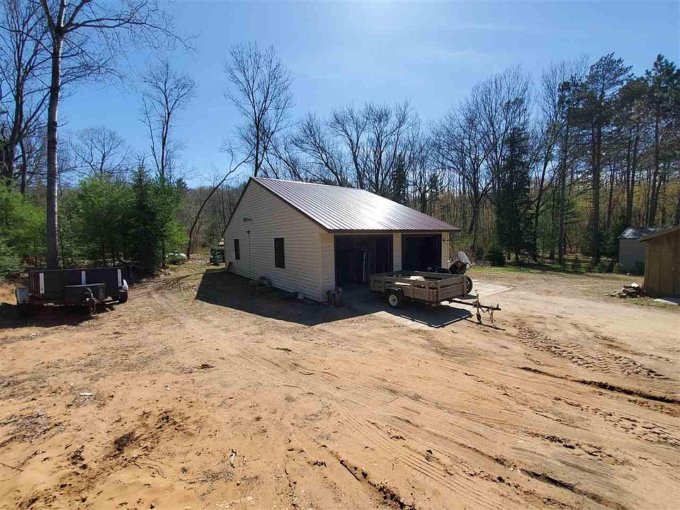 Buildable lot with a finished off heated garage (960 sq ft) with a metal roof and covered porch. The lot is level and wooded around the perimeter giving you that sense of privacy. Minutes from Waupaca near the end of a dead end road. The heater is included but the LP tank is not,