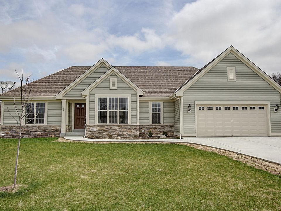 $317,500. Nearly New Construction on 2.64 Acres in the heart of the Kettle Moraine! Built in 2014, this 3 BDRM/2 BA split Bedroom Ranch design offers warm yet modern architectural details such as 9 FT & tray ceilings, WB FP, open concept footprint, 6 panel doors, radial corners & knockdown finish. Luxury Kitchen boasts center isle & stunning white cabinetry accented by bold Granite countertops. Inviting & spacious Master offers WIC & private BA with 36'' vanity. Convenient Main Level Laundry. Partially finished LL offers addl 1,700 sqft of living space! Views of the Forest from every room!