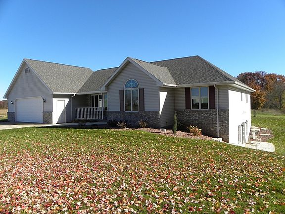 Spacious country ranch home with just over 5 acres of open and partly wooded land. Luxury tile flooring. Solid oak interior finishing with plenty of closets and built in storage including walk in master. The apple creek runs along the south end of property, abundant wildlife, including deer and turkey. Walkout basement is already stubbed for a 4th bathroom and walls are partly finished. Recent updates include architectural shingled roof New mound and septic (2015) New well pump (2020) New water heater (2016) New water softener and whole house filtration system (2021) New luxury vinyl plank flooring (2020) Entire inside of home painted in modern neutral colors (2020) New stainless appliance suite (2018) Outdoor storage building built (2019) Detached 2nd garage 30' x 40' with concrete floor and 10 foot walls (2023) New high efficiency 2 stage furnace and air conditioner installed (2023)