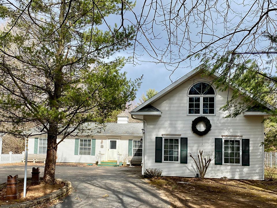 Executive Style 4 Bed 2 Bath home sitting on over 2 acres of land. Minutes from town on private dead end road. Offers plenty of storage with 3 exterior storage shed.Heated 2 car attached garage & circle driveway. Partial fenced backyard with concrete patio and fire pit. Close the pocket french doors for some privacy while you curl up in front of the fireplace. Come inside to see how you can enjoy this home sweet home.