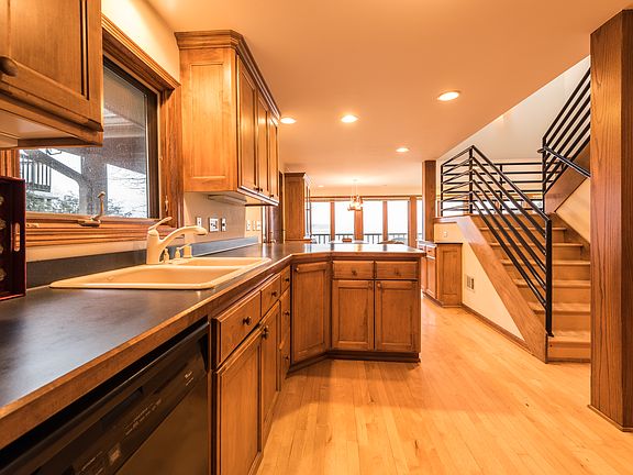 Finally an outstanding lake property at a great price! Hardwood floors, awesome views, Northwest lake frontage, new pier, concrete steps & landscaping are just the beginning! Main floor with great views from living room, kitchen, full bath & bedroom. Upstairs a beautiful master suite with private bath plus 2 more bedrooms & full bath. Redesigned walk-out lower family room allows for lots of lake living fun. Wet bar, gas fireplace, great views & remodeled full bath. A must see!