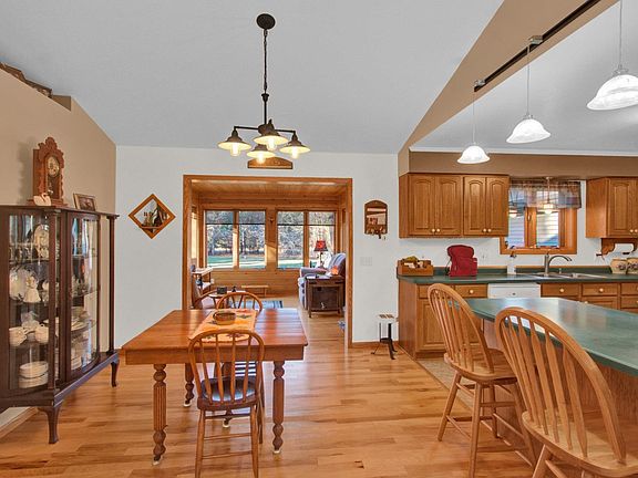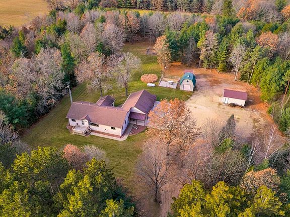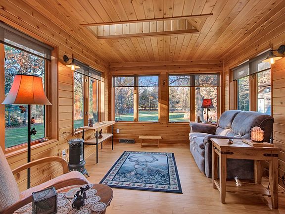 Truly inviting country ranch home on 20 wooded acres. Neat & tidy, this ultra clean home is extremely well cared for. This gorgeous home has cen/air, hickory flooring, sunroom (w/skylite), fireplace, laundry, 2 full bathrooms, 3 bedrooms and attached heated garage. Finished lower has pellet stove, finished exercise area, spa room, & workshop. Ample storage throughout. Property has large yard, fenced garden area, and mostly wooded 20 Ac. 3 extra garages for toy boat/4-wheel/etc storage. Just minutes from I-39.