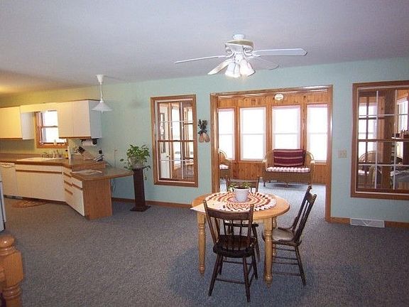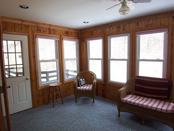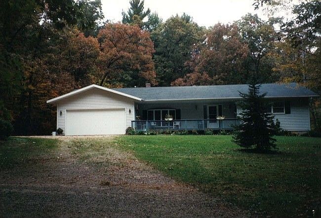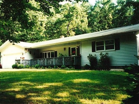 Beautiful wooded setting comes with this maintenance free 4 bedroom, 2 and a half bath ranch home located on a private setting on over eight acres of land. This lovely home has a sunken livingroom, an awesome master bathroom with whirlpool tub, central air, lovely sun porch, main floor laundry, two garages, full walk-out lower level and two decks. Appliances are included. Move-In ready, and at a Great Price!!
