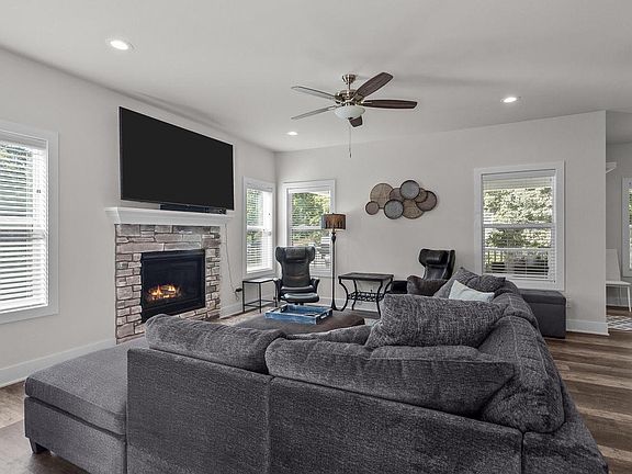 Gas fireplaceHeated garageEpoxy garage flooringStone fire pitRec roomFamily room with fireplaceWalk-in closet