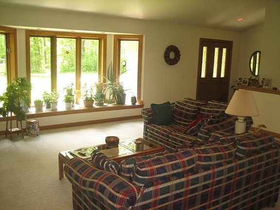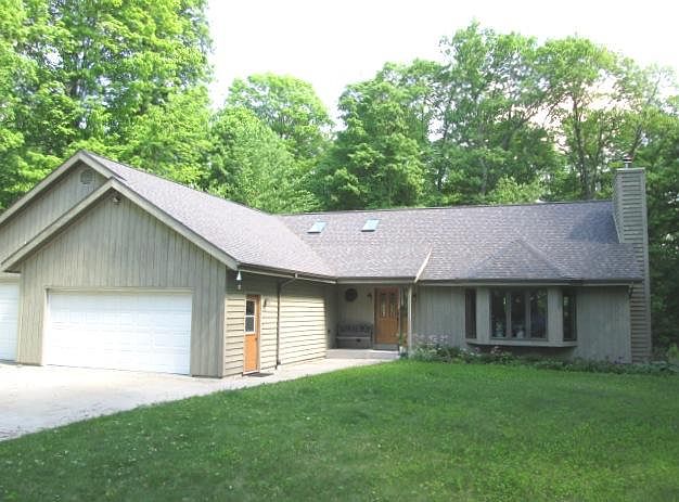 Custom design exposed-basement ranch. Main level has cathedral ceilings throughout; formal dining; large kitchen with breakfast-bay featuring beautiful views and deck access;3 generously-sized bedrooms; full-bath and private-bath with Jacuzzi in master-suite; laundry & 3-car attached garage. LL has 2 walk-outs; large family-room with wood-stove/fireplace; full bath & 4th bedroom. Home-site is embedded in Kettle-Moraine-type hardwood forest; 1-mile to village amenities; 12x24 'Cabin'.