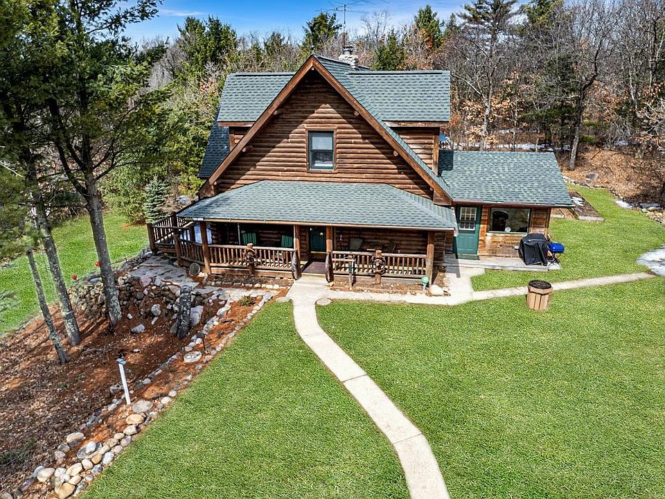 This property offers 30+ acres of wooded land with a 2200 sq ft full log exterior home that features a covered deck with views of Western sunsets. The home has large windows and a patio door in the living room that provides natural light. The kitchen has a granite island and seating area. There is a full bath on each floor, a main floor bedroom, 2 large beds on the upper floor separated by a sprawling loft area, and a lower level with an additional family room, bar with seating for 8, and space for a poker table. Additionally, there is a shed with electric and an oversized pole barn that could park 4 or more vehicles. The wildlife frequents the area and often deer walk past the home taking time to graze. Located close to Wautoma. Silver Lake, Pine, and Fish lake close by