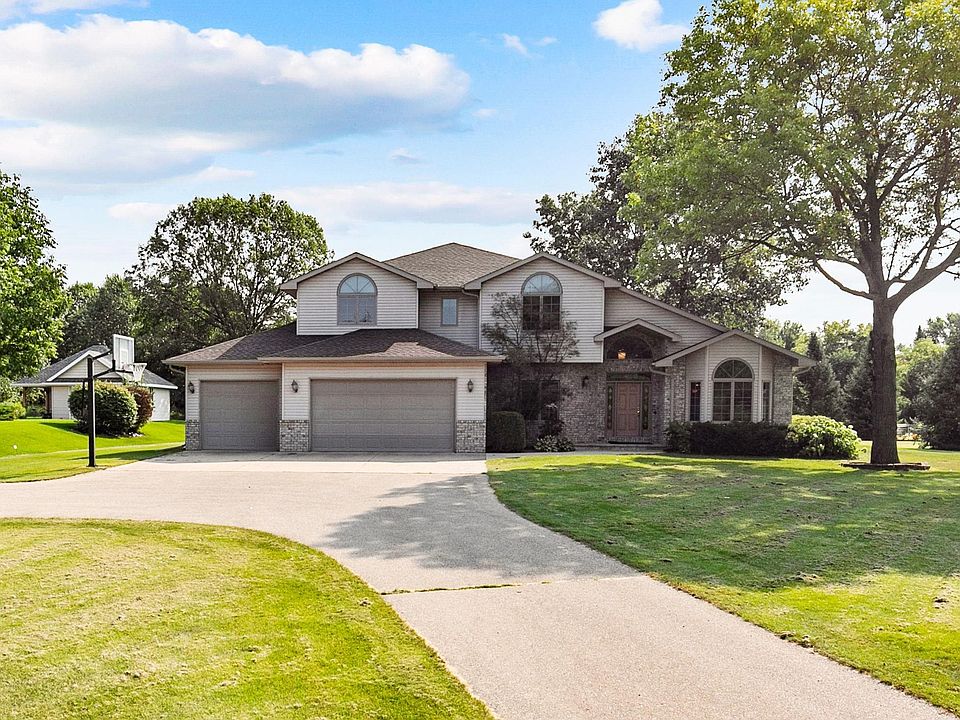 Fantastic cul-de-sac location near New London High School! 4 bed, 3.5 bath on 1.23 acres. Open, flowing main floor features vaulted ceilings, great room w/floor to ceiling f/p, large kitchen w/loads of cabinets, 4 season rm overlooking backyard, 2 gas fireplaces, formal dining, separate office w/built-ins, formal living rm, laundry/lockers, and main floor master suite. Upper has 3 bedrooms, 2 full baths, 2 bedrooms connect to joint full bath, also an upper office landing area. Heated floors in kitchen/master bath. Large LL family room w/egress, additional 4th bath waiting to be finished. Tons of basement storage, basement access from garage. Stamped concrete patio. New Roof July 2022. Furnace, water heater, water softener 2020. Covenants allow use of private swim/fish pond 2 blocks away