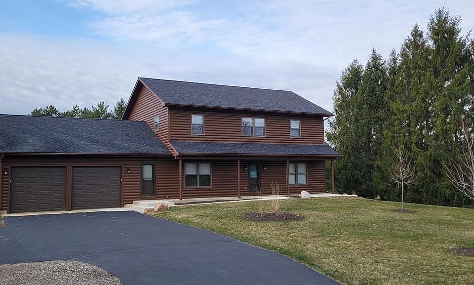 Rural three bedroom home situated on five acres of privacy in the Town of Darien. This log sided home features a welcoming kitchen with laminate floors, new stainless steel appliances, ample cabinet space and a built-in desk area. The bay window in the dinette looks out on the manicured lawn and small grove of fruit trees. The living room includes a built-in fireplace and recessed lighting. Upstairs, the master suite, includes a walk in closed, soaking tub and walk in shower. The finished lower level consists of a spacious family room and work shop/craft room with access to the outdoors through a second stair case. The over-sided 2.5 car garage is extra deep with additional room for projects and storage.