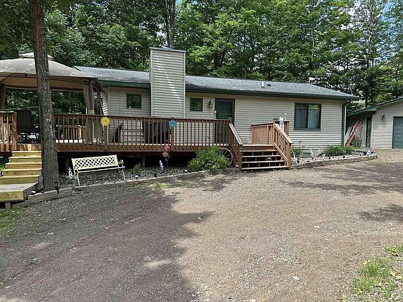 This inviting 4-bedroom, 2-full-bath home sits on a peaceful 1.15-acre lot at the end of a dead-end road, offering privacy and beautiful surroundings. Inside, you?ll love the recently remodeled kitchen, blending modern updates with everyday functionality. The spacious U-shaped driveway leads to a detached 2-car garage and plenty of parking. A large deck recently all stained that wraps around two sides of the home, perfect for relaxing or entertaining while enjoying the gorgeous landscaped yard. With its thoughtful layout, updated finishes, and serene setting, this property combines comfort, convenience, and charm ? ready for you to call it home! Septic: requires to be pumped every 3 years.