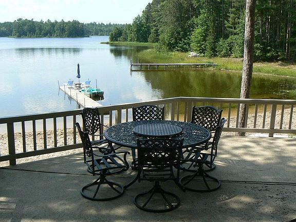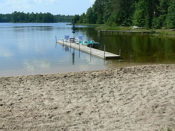 Lost Lake - 2BR cabin/Home has a third loft bedroom on 150' of sand frontage. Home is well maintained. Walk - out basement - electric sauna, gas fireplaces up & down. Newer windows, patio doors & flooring. Updated electric. Automatic generator located in the garage & great swimming for young and old. Pole roof for camper/5th wheel storage. Mostly new furniture available- to be sold separately.