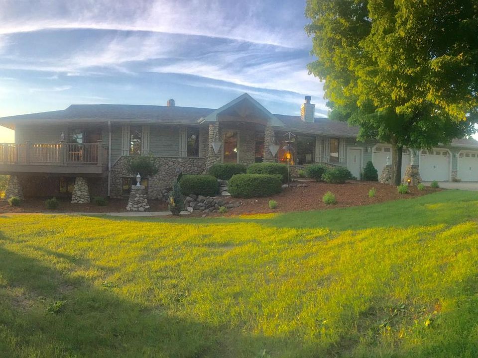 Outstanding 3 BR, 3.5 BA custom ranch home, impeccably landscaped on gorgeous 2.4 acres w/incredible views! Pride and craftsmen-ship in every detail; custom stonework inside and out! Sunken GR w/NFP, open concept KIT and dining area! MBR suite w/huge WIC; private patio door to deck! Large BR2 and BR3 w/double closets. Walkout LL has built-in hickory entertainment area w/wet bar and granite counters. 2nd FP in huge FR! CT in baths, 1st flr. laundry area! Maintenance free exterior; including gorgeous deck and custom covered pergola! 3.5 car 29X44 att. GAR; plus heated ''cottage'' worksho