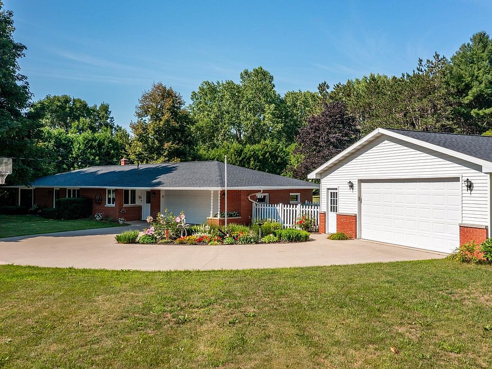 FREEDOM, ZERO ENTRY, ALL BRICK RANCH home, gleaming with so many updates & years of love, situated on 1.25 acre lot - within walking distance to everything in town & the simplicity of municipal water & sewer. Updates galore: engineered hickory hardwood floors, newer carpet (2018), roofs (2022), furnace & A/C (2020), detached HEATED shop (2002) to name a few. There is even a second, rear overhead door in the shop! Epoxy in the attached garage for easy clean up AND three entrances from the garage into the house - into the kitchen, down to the basement and into the primary bathroom. So much convenience. The backyard is so private with a 20x30 concrete patio, a pergola, as well as many mature trees. Don't let this gem slip by. It's a beauty.