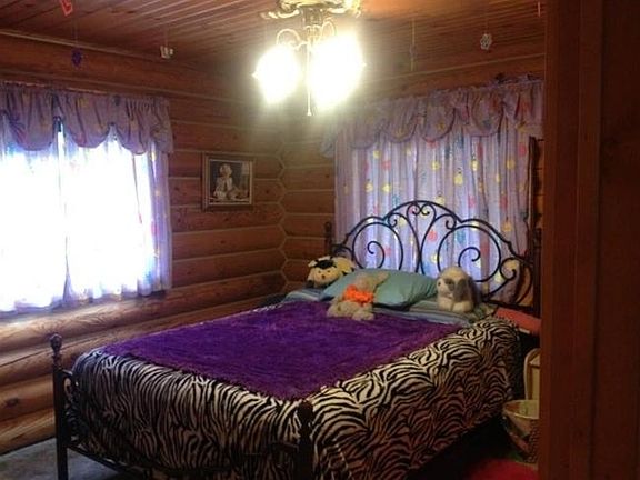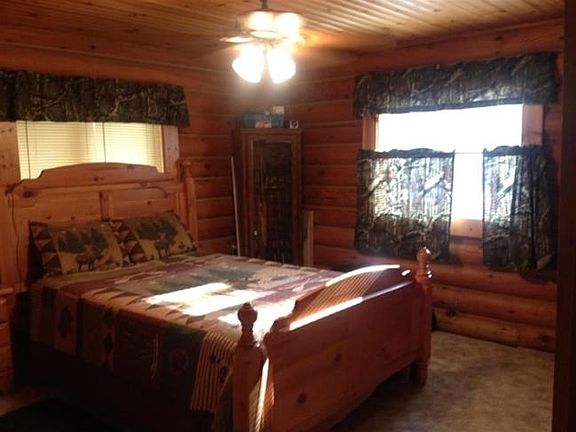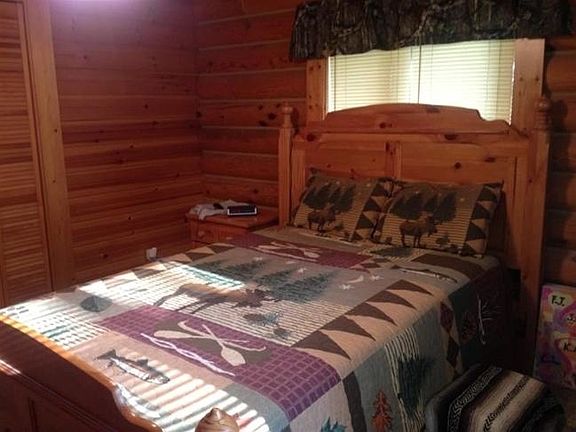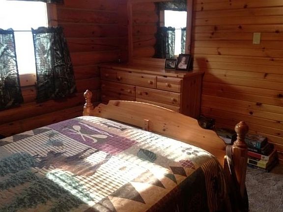 Seclusion at it's best. Tree lined driveway leads to a 2 bedroom log cabin nestled on 4.1 acres. Open concept. Office/den facing the back is a great place to view daily wildlife of deer and turkey. Basement is finished with a large family room area and another den. 936 sq. ft. garage workshop area along with another 3 sided storage shed. Large front porch. $159,000.