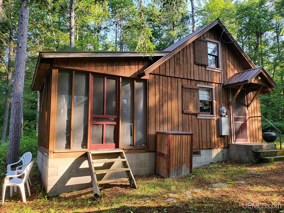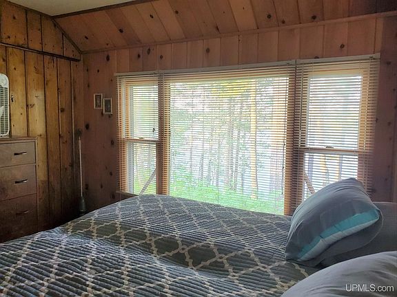 This seasonal, turn-key, cottage retains some of yesteryear's charm coupled with today's modern conveniences. It sits high on a bluff within a private, wooded, setting. The screened-in porch provides the best seat in the house -- except, of course, those experienced while seated inside around a crackling fire. There is a sizeable main floor bedroom (which was added in 1961) and a loft for overflow. The interior is timeless and classic with knotty pine walls, sustainable wood floors, and solid wood doors. The landscape consists of natural foliage and ferns, with the native lake shore accessible by a rustic wooden staircase.