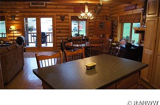 Full log home on quiet dead end road. Vaulted ceilings, open staircase, hickory cabinets, loft, infloor heat in basement, private deck & covered porch. Manicured lawn with perennials, shrubs, fruit trees & lighted 60' waterfall. Attached garage has infloor heat. 40x64 poleshed w/concrete floor. 24x40 dog kennel area w/infloor heat and AC that will house 14 dogs. Approx 8 acres tillable; the remaining wooded. Hunting in the area is some of the finest.