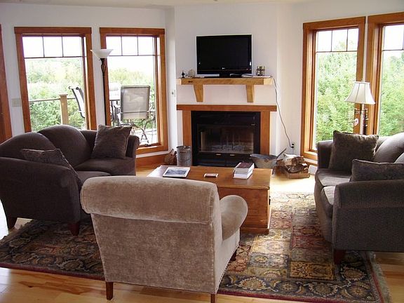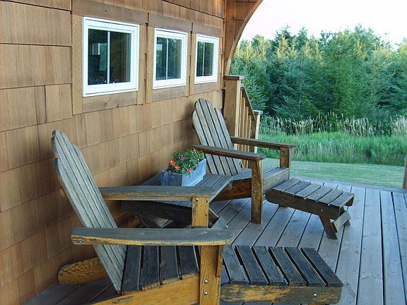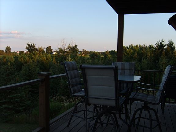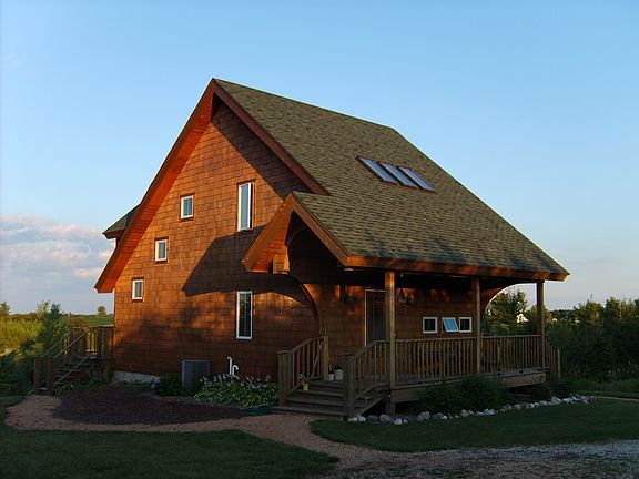 Secluded vacation home. Living room and kitchen are part of a large open area with hardwood flooring. Kitchen includes 12' of custom natural wood cabinets with laminate counters. Living room has 3 large windows facing the rear of the lot and features a corner fireplace which burns either wood or gas. Half bath is on the main level. Upper level consists of an upscale master bedroom suite which overlooks the rear of the lot including the pond. There is a 6 x 16 ft. deck off of this bedroom. Master bath is upscale in design and quality. It features 3 sylights, an elevated whirlpool tub set into a tiered tiled platform plus a 5 x 7 ft. tiled shower. Basement is fully exposed to the rear of the home and includes a bedroom, family room and 3/4 bath. It is finished with the same quality as the main living area. Exterior of home has natural cedar shake siding. Front open porch is 7 x 21 ft. and rear deck is 9 x 22 ft. There is also a stamped concrete patio off the basement which has a semi-circle shape and measures 26 x 23 ft. Garden shed is approximately 8 x 12 ft.