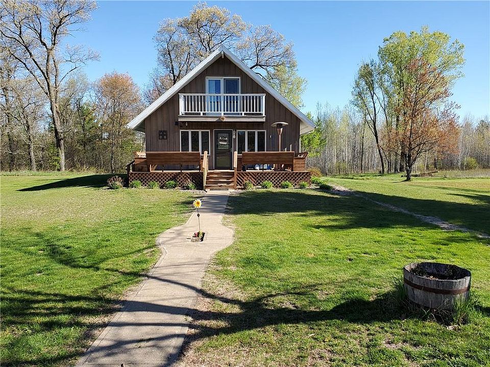 Chalet style home w/1248 sq ft of living space featuring 3BR, 1.5BA and main floor laundry. Front deck off living room and smaller deck off 2nd level bedroom. Detached metal 30x32 garage w/electric was completed in Dec. 2020. Also a 24x24 old garage w/o electric. Property consists of 20.85+/- acres of which 15+/- acres are wooded, complete with pond. If you're looking for a home in move in condition with hunting land, look no farther.