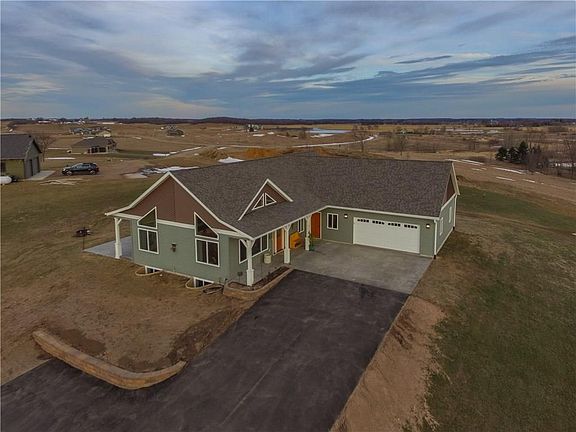 Welcome to a Custom Built 2017 Parade Home! A spectacular 3 bed/3 bath, craftsman style home w/spacious open floor plan on 2.6 acres just south of Elk Mound. Large master bedroom has a master bath w/walk-in tiled shower. View from the living room windows provides a 180 degree view of the surrounding area. Large trapezoid windows and vaulted ceiling. Finished basement w/Full bath. Attached heated workshop w/side entry. Quartz Counter-tops in kitchen. A zero-step entry home from garage to home.