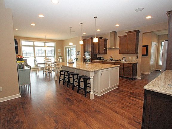 Amazing 4 bedroom, 1st floor master and 2 story great room with floor to ceiling windows. Stunning eat-in gourmet kitchen with granite, large island, serving bar with beverage refrigerator & stainless appliances. Hardwood floors, painted millwork, 2 sided gas fireplace between great room & bumpout breakfast area. Boot bench lockers in tiled mudroom. 3 bedrooms, 2 baths up. Lower level has family room with 9ft ceiling, full windows, storage areas & is plumbed for full bath. Azek 2 level deck, fire pit, professional landscaping & backs to large common green space. Many upgrades. Enjoy Cedarburg!