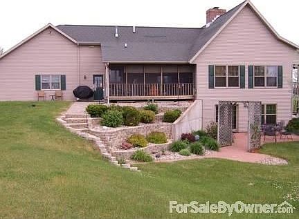 Beautiful home and barn/pole shed on 5.5 Acres just 17 miles from Appleton. This custom built home is a MUST SEE to truly appreciate. Great room with vaulted wood ceiling and 2-story fireplace. Lofe bedroom overlooking Great Room, Gorgeous wood cabinets throughout, ceramic tile in entry hall, kitchen and laundry room, as well as bathrooms. Master Bath with commercial grade jacuzzi tub. Finished 1,521 sq. ft. walk-out daylight basement with large bedroom, living area, full bath and large storage area. Two porches, one screened. Exceptional landscaping at back of house with tiered planting areas and brick patio. Large 42 x 80 barn/pole shed with four stalls, 12 x 40 heated workroom, 7 dog kennels with outside covered runs, hay storage, two 14 foot overhead doors. Fully fenced pasture. Additional property info: http://www.forsalebyowner.com/listing/HF3DN?provider_id=28079