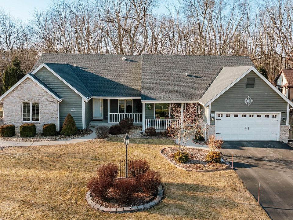The first step in allows you to see through the living room and be wowed by the soaring vaulted ceilings, abundant natural light, and a relaxing fireplace. The kitchen features quartz counters with glass tile backsplash, newer appliances and a solar tube to let the light pour in. Convenient main floor laundry, and a front den/office or use it for formal dining. Enjoy outdoor entertaining, grilling and looking out over your large wooded private back yard. In the rest of the main floor, you will find the sizable primary bedroom offering a generous WIC, a private bath with a walk-in shower, the 2nd bedroom and the second full bath. 2 car garage and unfinished basement, perfect for a 3rd bedroom or your finishing ideas. Enjoy all the benefits of this wonderful home with no monthly HOA fees!