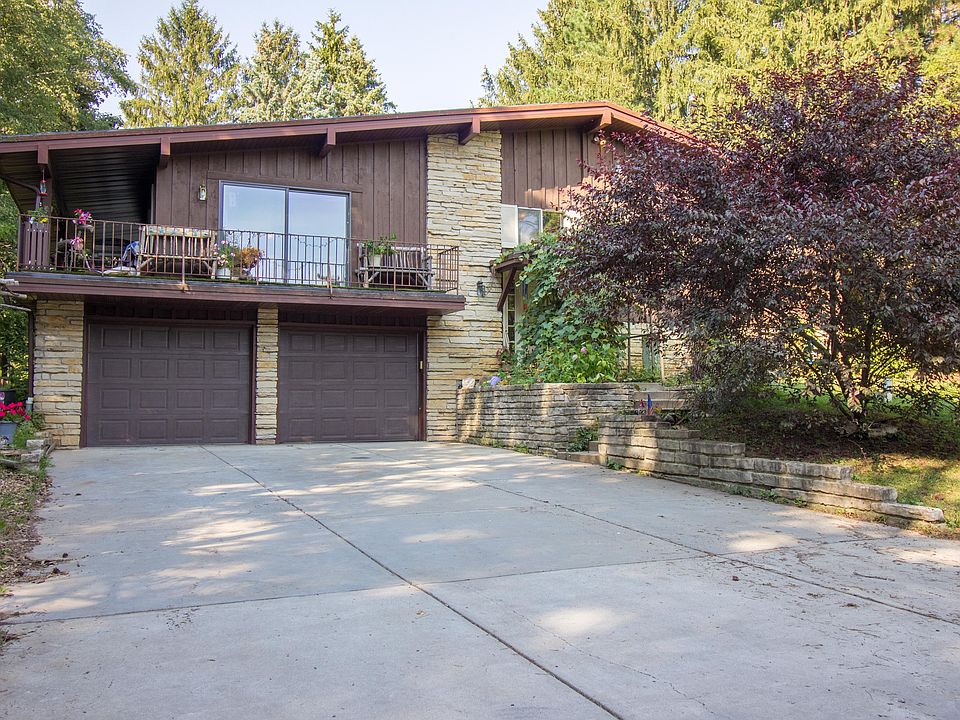 This 2,500 square foot, 5 bedroom, 2 bath home is nestled on approximately 2 acres of private forest in the desired lake country area of South Eastern Wisconsin. The home resides in the award winning Pewaukee and Arrowhead/Richmond school districts. Easy quick access to both the Hwy 16 and I94 travel corridors with drive times of 25 minutes to downtown Milwaukee and 55 minutes to Madison. The exterior of the house features a wrap around porch leading to a huge backyard deck. A unique highlight of the property is a separate office/cabin building complete with a wood stove and electricity via extensions. The interior is decorated with lodge-like accents including decorative stone walls and rustic custom made railings. The floor plan is truly open concept offering various layouts for your main living space. The lower level garage space was completely renovated in 2020 to increase the living area of the home to about 2,500 sq. ft.. An unattached 2.5 cement floored garage was constructed at the same time.