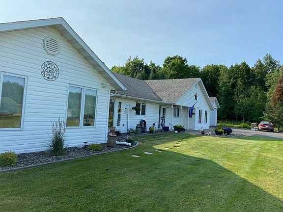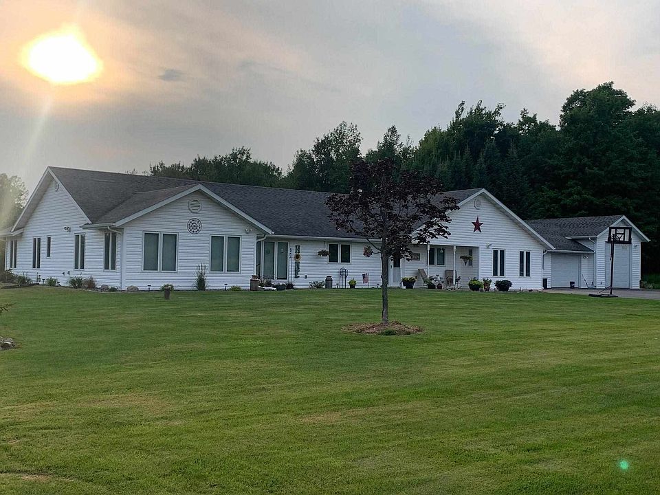 Gorgeous home in the country all on one level with stunning landscaped yard complete with a new poured concrete patio to enjoy the sunsets located on 8.55 acres. Master bedroom has a bathroom and walk in closet, 2nd bedroom has large closet with its own bathroom, 3rd bedroom has one full wall of bookshelves. No need to worry about storage in this kitchen with abundance of cupboard space and three large pantries. Attached 2+ car garage with lots of shelving plus a outer stick built storage building with cement floor. A must see in person to get the full appreciation of this large open concept home.Generator that will run the whole house if needed. Generator does kick on once a week for about 5 minutes just to cycle through. Septic is a Sand Mound system that you only pump once a year. New water softener 2018, Dishwasher 2019, Refrigerator 2020. Added a Pellet Boiler in 2018. In-Floor Radiant heat keeps this home so nice in winter. LP tank and Water Softener are both sellers owned and will stay. Sellers in the summer run the LP boiler for the water heat. In winter time is when they use the pellet boiler for the heat and water. The LP is backup then.