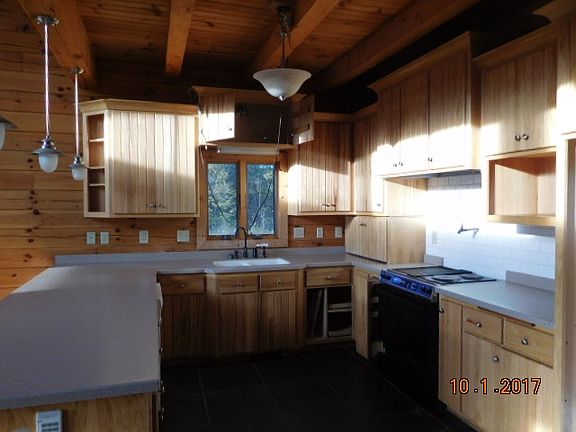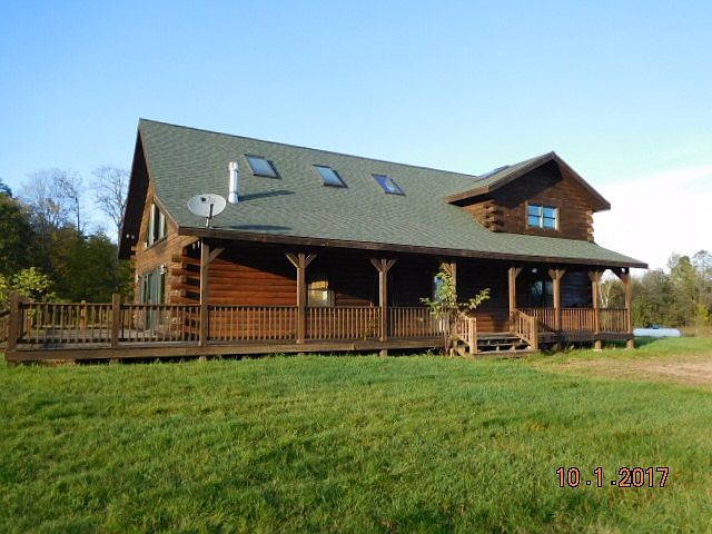 This 20 acre quiet rural setting for this full log home overlooking hillside below and surrounded by woods. This home has a covered front porch that wraps around to an open west side sun deck. The main floor large great room includes the kitchen, dining area and living room with large stone fireplace and cathedral ceiling, ceiling fans, sky lights and French doors that open to the large west side sun deck. Also on main floor is a pantry and 2 large bedrooms with a full bath. Upper level has large loft area and large master bedroom with walk in closet and full master bath. Lower level has walk in French doors with nice area for mud room, 2 unfinished bedrooms with egress windows, stubbed in bathroom. In floor hydronic/hot water heat on this level. Laundry hookup and utility room. There is a large 50 x 50 Cleary building with 5 inch thick concrete floor and water hook up. The best part is that you get to pick out some of the finishing touches. Another cabin across street is included