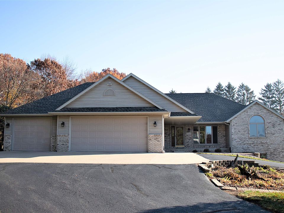 Perched high in the neighborhood, countryside views on a secluded cul-de-sac on over 1 acre. Brand new roof!! Well maintained & updated, open concept walk-out ranch. FF laundry. Vaulted, open concept main living area. Large kitchen, spacious island, eat-at counter, updated appliance package, gas stove & hickory cabinets. Open Living room area w/new carpet, large windows, new floor-to-ceiling stone gas FP. 4 seasons room overlooks beautiful pro landscaped back yard. Main BR 2 closets, full bath, walk-in shower & dual vanities. Full, finished lower level w/exercise room, full bath, BR & work shop room w/garage access to LL & full walkout. Huge 3 car garage, H&C water, heated & finished. Back yard with stamped concrete patio & gazebo, storage shed and plenty of opportunity for more! HURRY!