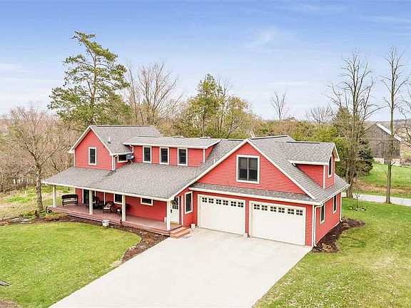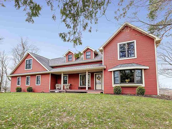 Watch the country sunsets from the back porch from this amazing Farmhome. Completely refurbished in 2009 this meticulous 3 bdrm/2 bath home sits on 4.25 acres with woods and trails where wildlife flourishes. 1st flr master bed w/french doors to deck and walk-in closet. White woodwork kitchen w/subway tile and incl: all appliances w/Wolf Range. LR w/lrg bay window leads to a lrg DR w/ partin tray ceiling, custom barn door to office/laundry room. 2nd flr , 2 spacious bdrms, full bath. Huge bonus room w/stub for another bathroom above 2 stall finished garage. Composite decking.. Shared driveway.