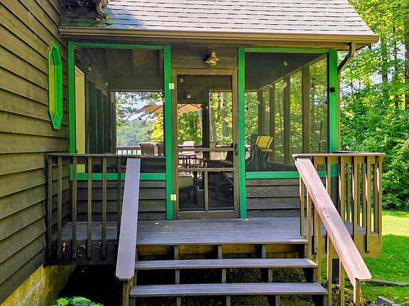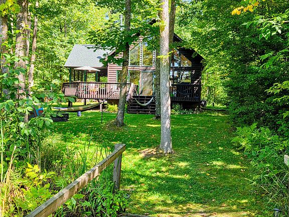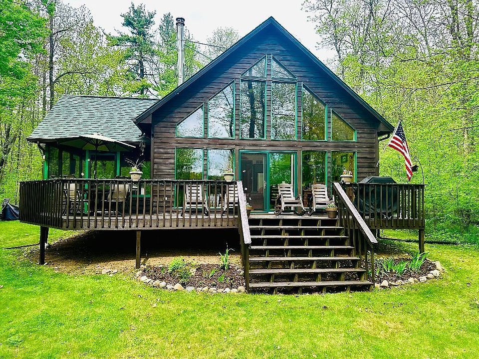 This stunning chalet-style home on Potato Lake features a western exposure that enhances its natural beauty. The main level includes an open-concept design encompassing the kitchen, dining area, and living room, all adorned with hardwood floors that create a luxurious yet cozy atmosphere. The main floor includes two bedrooms, complemented by a spacious loft that serves as a third bedroom. Additionally, there is a convenient laundry area on the main level. A perfectly positioned fireplace on the main floor offers both warmth and picturesque views of the lake. The living room opens to a full-length deck, along with a charming screened porch, ideal for relaxation. The expansive private backyard leads to level frontage on a prime fishing lake, providing an exceptionally secluded setting with easy access. Property IS NOT in the Flood Zone