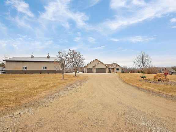 You're guaranteed to fall in love with this beautifully updated 4 bed/3 bath vaulted rambler located on 3.62 acres just a short distance from town. Upon entering this desirable open-concept main-level you'll instantly feel at home. The warm flooring throughout the kitchen, living and dining area pairs perfectly with the modern white kitchen cabinets, doors and trim. The spacious primary suite is perfect for those wanting a private escape. This walk-out space features a fully remodeled private bathroom, walk-in closet and vaulted ceilings. The walkout lower level is tastefully finished offering 9FT ceilings, 1 add’t bedroom/bath and a very spacious family/rec room. Don’t forget about the 32x50 fully finished, steel lined outbuilding w/ 10x50 overhang which comes complete with forced air heat & AC + 200AMP ele. w/ 240. Recent updates include fully remodeled bathrooms, flooring, lighting/plumbing fixtures, furnace, tankless water heater and roof making this home ready for it new owners!