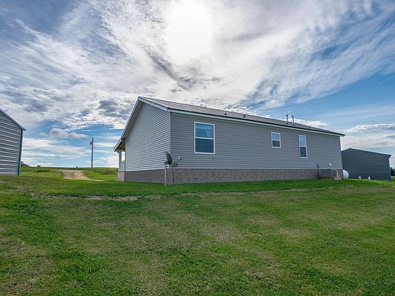 This unique prairie style home offers expansive vista views from a sprawling front porch and every well placed window. Set on 9.9 acres, the gently rolling prairie views appear endless. A well designed open floor plan provides convenient one level living. Three bedrooms and two baths, with a spacious kitchen, are all nicely updated with excellent fit and finish. Largely maintenance free on the exterior, including metal roofs, the home is flanked by two large outbuildings. Thoughtfully designed to match the style of the prairie home, these buildings provide over six car access, with plenty of room for your favorite hobby or home based business.