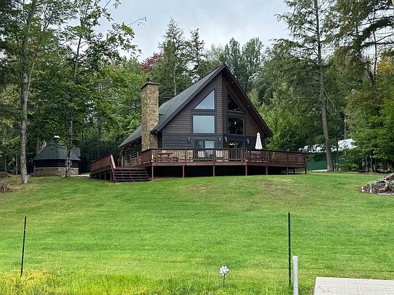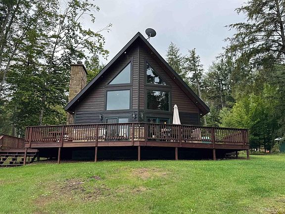 125x139 Stunning 3-bedroom, 2-bath A-frame home on Corner Lake with a primary suite featuring a walk-in shower, mini-splits for A/C, in-floor heat, and a cozy wood-burning stone fireplace. The modern kitchen boasts granite countertops with seating for six at the bar—perfect for entertaining or casual meals. Enjoy lake views from the large deck or relax on the covered front porch. Outdoors, entertain year-round with a unique indoor fire pit and wood-fired pizza oven, complete with electricity and seating—perfect for rainy days. Property includes a shed, dock, and plenty of room to build your dream garage. All of this on the well-desired Chain of lakes, with access into Deep lake, Skeels Lake, and Straight Lakes. A beautiful sandbar is just a quick kayak/boat ride away—perfect for gathering with friends and family for volleyball and fun in the sun!