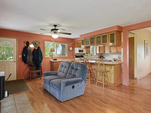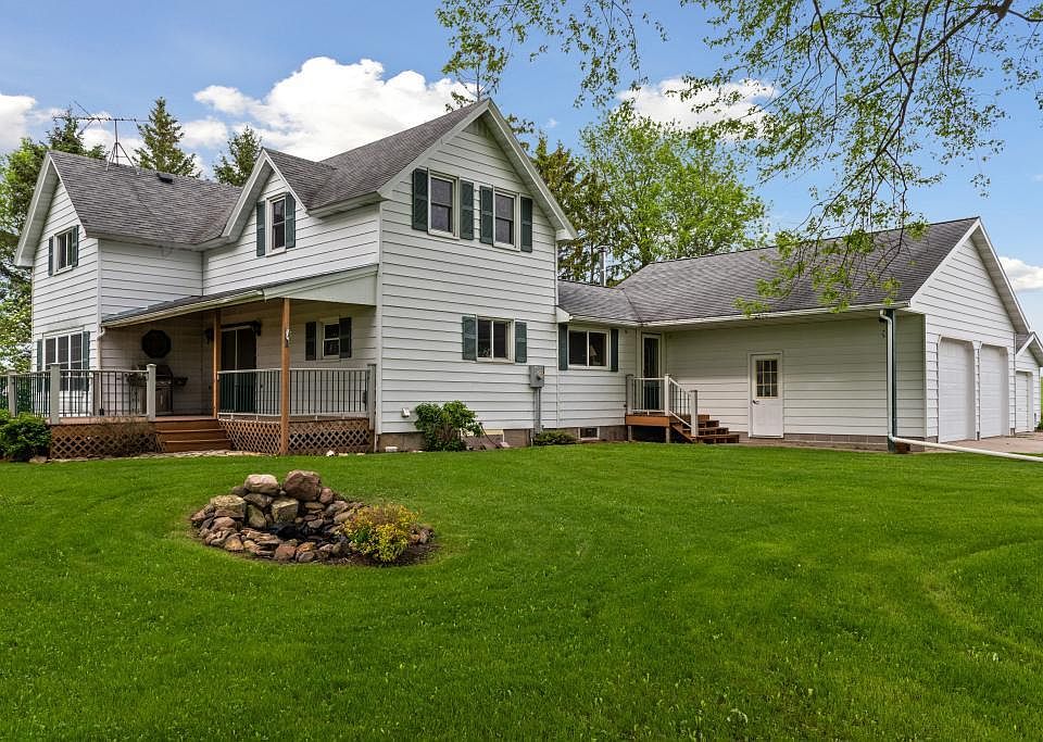 Country retreat on 1.37 acres, with storage galore including huge pole shed! Updated kitchen, baths, plus carefree laminate floors on ML. Several windows lend to great natural light throughout. Gorgeous kitchen has plenty of cabinets, tile backsplash, breakfast bar, built-in desk plus bonus center island. Charming wood stove in Living room, sliding doors lead to back patio. Separate dining has French doors to large Family room with beautiful built-in wall unit, plus sliding doors to spacious composite deck. Owner's suite w/ lovely views, ceiling fan, nearby full bath. Bonus 1/2 bath andlaundry on main level. 3 bedrooms on upper level plus walk-in closets and 3/4 bath. Spacious unfinished basement with potential for additional Family room, workshop, root cellar, and more! Attached oversized 2 car garage, plus additional single car garage. Mature gorgeous trees and landscaping. Nearby Rush River and Ellsworth Country Club.