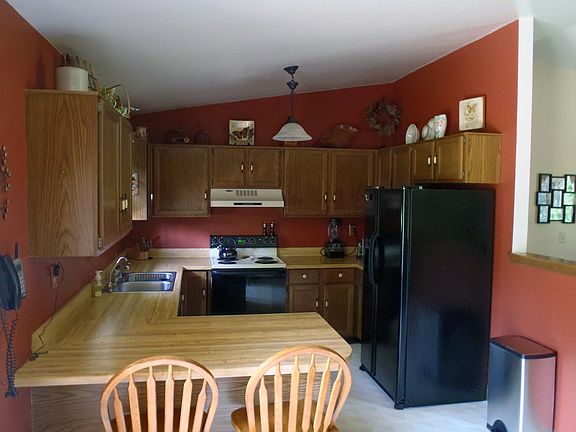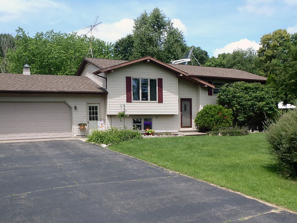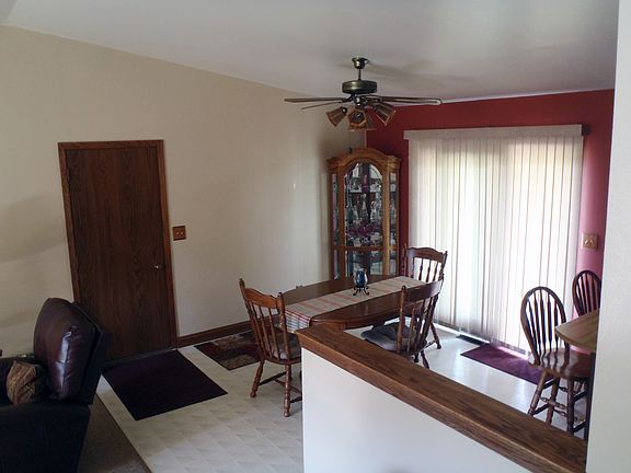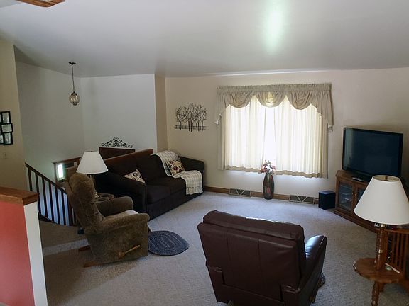 4 Bedroom Bi-Level home. Upper level has 3 bedrooms, full bath, open concept living, kitchen and dining rooms with vaulted ceiling. Lower level has large family room with built in pellet stove. 1 bedroom or office area and 3/4 bath with built in redwood sauna. Unfinished utility room contains gas furnace and water heater, washer and dryer hookups. Also has auxiliary solar water heater. Landscaped yard with perennial flower beds, wildflower prairie areas, mature trees and green space. Yard also has an invisible fence for pet safety. Home is located in a small quiet subdivision on a cul-de-sac road with nearby access to golf course.