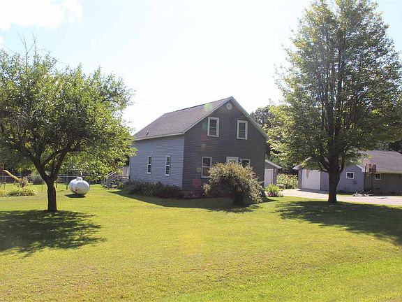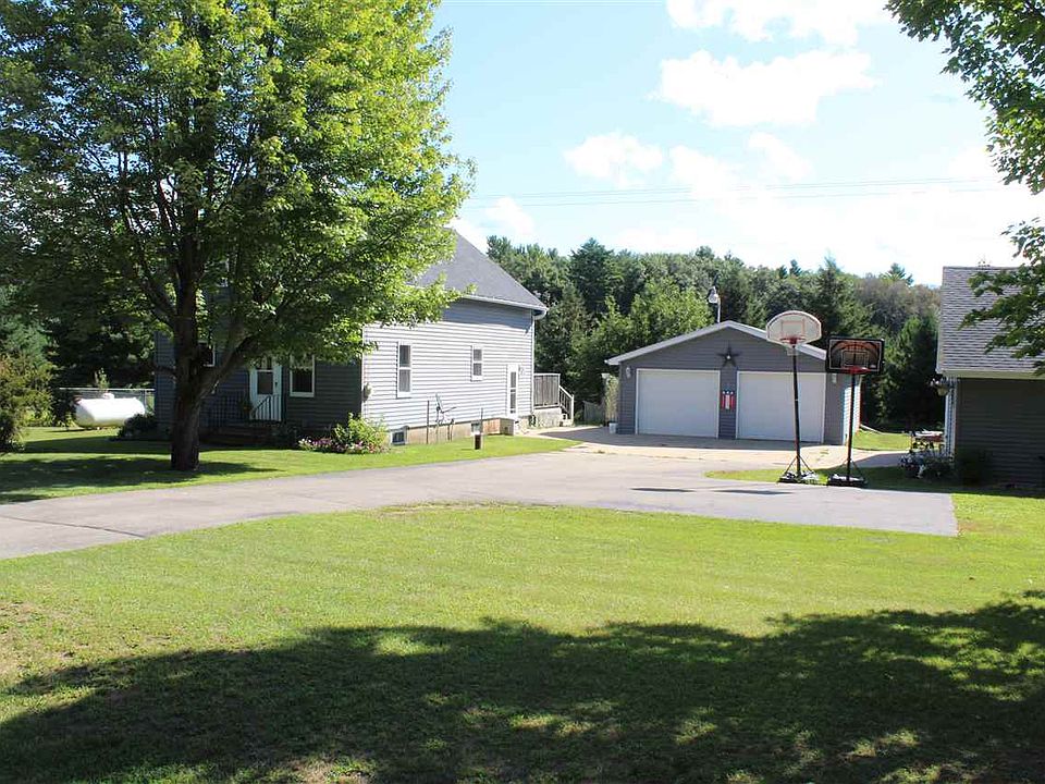 Surrounded by trees, this private setting is just over an acre and 3 miles north of the City. Great yard with fenced in play area, garden and multiple apple trees. Two garages with the larger one being insulated, heated and has an overhead door on each end. Inside the home you have 4 bedrooms feature a spacious, duel or walk-in closet. There's a main floor bedroom, partially finished basement and the patio door off the dining area lead to the back deck. The LP tank is included and the seller is offering a 1 year home warranty.