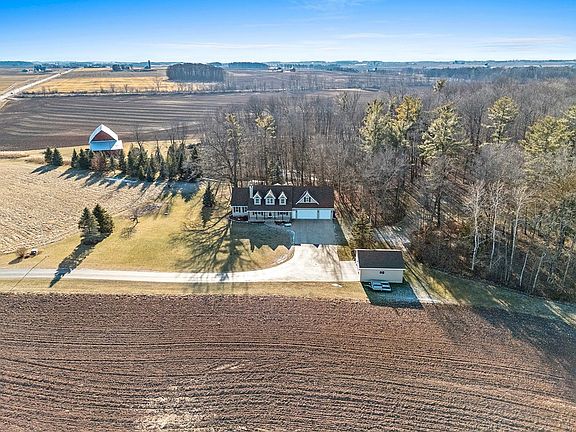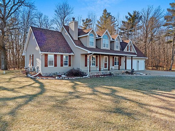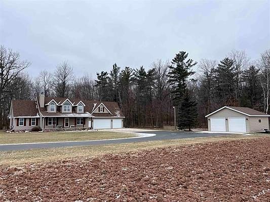 Welcome to the Countryside Maple Brook Cape Cod. Settled on 5.4A back dropped with woods and walking trails to get back to nature. Grab your syrup buckets! Great curb appeal with a covered porch and cedar posts. The sunroom overlooks your very own wooded acreage. Home has 3 beds and 3 full baths, 3 stall attached garage and a 2 stalldetached garage. Living Room has a wood burning fireplace and main level is Open concept kitchen, dining, and living room makes for great entertaining. Primary Bedroom with walk in closet on main level. Laundry on main floor behind pantry. Laundry hook ups in LL as well. Lower level access from inside and garage. All garages are insulated. Close to ATV/Snowmobile trails. Full Dream home Vibes. Photos Coming Soon