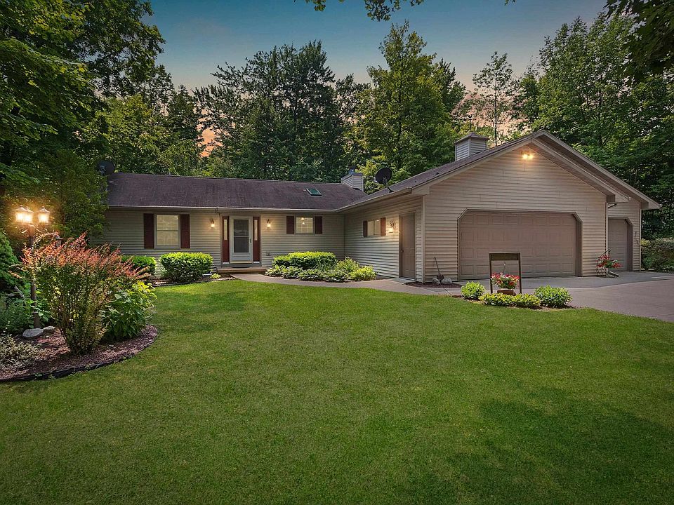 Welcome Home! As you enter the tree-lined drive you are greeted by this picturesque home tucked away on over an acre of land. Step inside to the bright, open-concept main level with a floor to ceiling fireplace centering the room. Enjoy the sun-filled kitchen with vaulted ceilings, large island + 360 views of the beautifully maintained outdoor living space. Wind down in the spacious master bedroom with private bath + WIC. An additional bedroom + full bath finish off the main level. LL includes mud room with access to garage + a spacious office. Entertain on the expansive deck with patio access + soak in the peaceful surroundings+scenic views. Convenient 12 x 19 garage/workshop for projects or storage. Offers to be presented no earlier than June 26th, 2023.