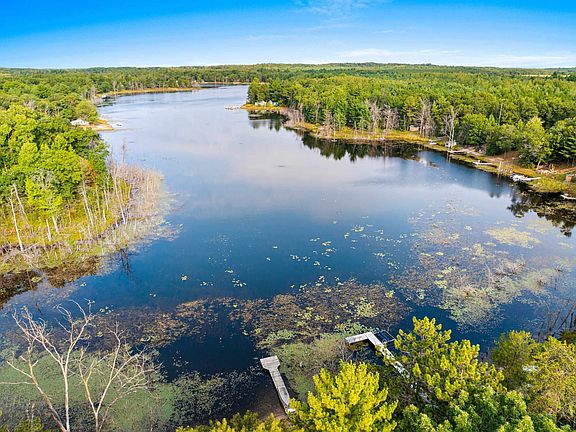 Experience year-round lake living on 5.8 private acres with approximately 236 feet of Long Lake frontage, including a sandy beach area. Spend mornings on the covered porch, afternoons on the patio, and evenings watching the sunset over the water. The upper-level loft serves as a bunkhouse/bedroom, while the walkout lower level offers a bedroom or office with walk-in closet, full bath, and rec room for guests. The kitchen with hickory cabinetry flows into dining and living areas with lake views. A secondary access off Aniwa Lane provides flexibility for future building plans. Features include an attached garage with 220-volt outlet, 26x26 shed/garage, and 50-amp RV hookup. This lakeside retreat offers year-round enjoyment, privacy, and a peaceful setting. Some virtually staged images.