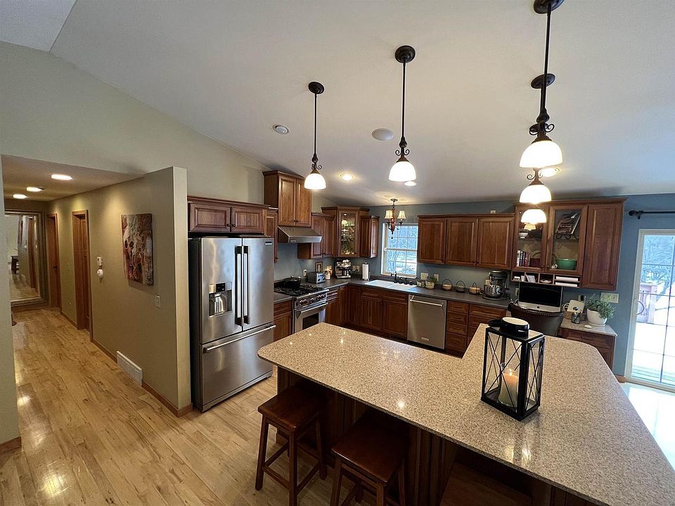 Beautiful 4 bedroom, 3 bathroom country home on 5.45 wooded acres. Amazing open concept kitchen, dining and living areas. Kitchen boasts granite topped island with generous seating spaces. Stainless refrigerator, dishwasher and Wolf range included. Solid wood cabinets, multipaned doors and flooring throughout main floor. Sliding French doors from dining room, open onto the deck, overlooking the nicely landscaped backyard. All bedrooms have walk-in closets. Main bedroom with ensuite bathroom. 3 bedrooms, 2 full bathrooms and laundry/mudroom conveniently located located on the main floor. Lower level has walkout to patio with French doors, huge family room with kitchenette, additional bedroom and bathroom. Attached and detached garage with space for 4 vehicles.