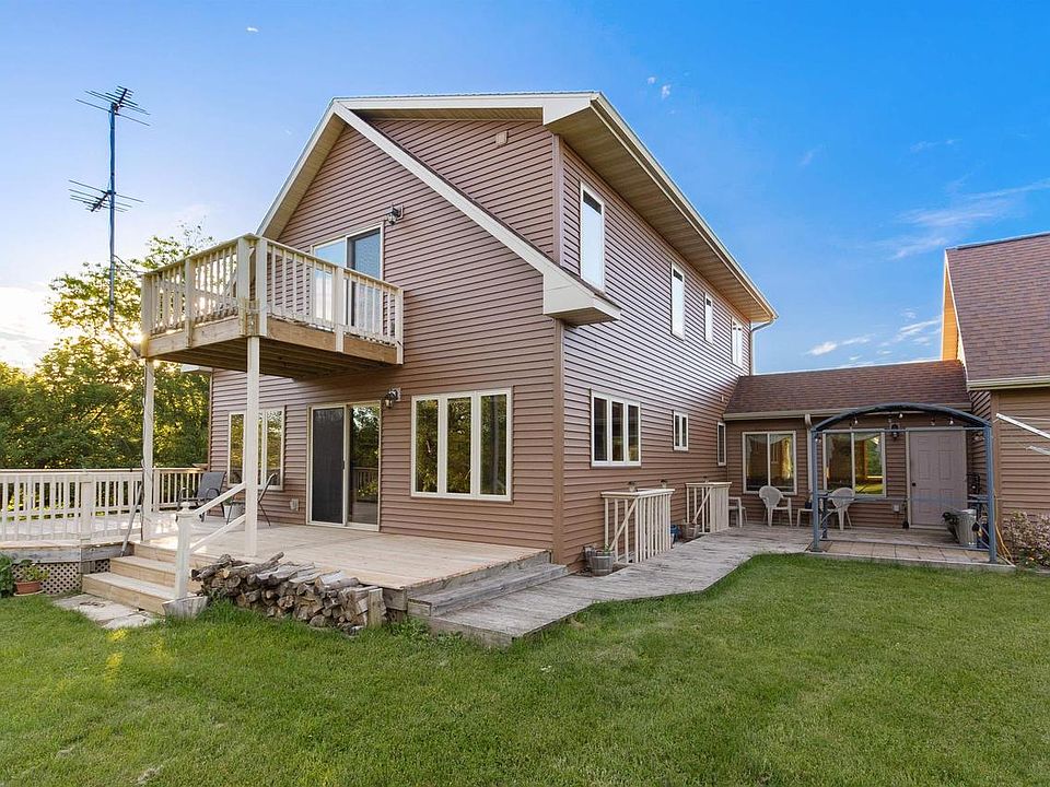Amazing contemporary home on 8.8 beautifully landscaped, sprawling acres! Can you imagine a peaceful water feature in your front yard, with fish included?! 2 car attached garage with additional 5-6 car garage/pole building. Wood shed with wood too. Inside there's a custom, handcrafted field-stone fireplace in the front-room, open concept to eat-kitchen and dining. All appliances included! Hard wood flooring, solid wood doors and cabinets through-out. Massive wrap-around porches and patios on all sides of the home. Main floor bedroom, bathroom and dedicated laundry room. Adorable sunroom, overlooking the pristine back yards orchard and gardens. Upstairs is the huge main bedroom, with it's own balcony, and walk-in closet. Here also is a 3rd bedroom and another full bathroom. On the lower level you'll love the convenience of an office with it's own entrance. Bonus: Another kitchen, great for guests or mother-in-law suite. Extremely energy efficient, Steffes Hydronic Furnace System. Radiant Hydronic heating with electric thermal storage.,30x60 pole shed with a full 13' lean to, 10 x 20 enclosed lean to with southside opening. Inside there is a 16x 20 insulated shop with a 7x5 walk in cooler! 100 amp service. Room for 5-6 cars.