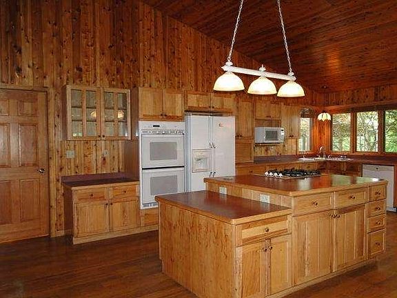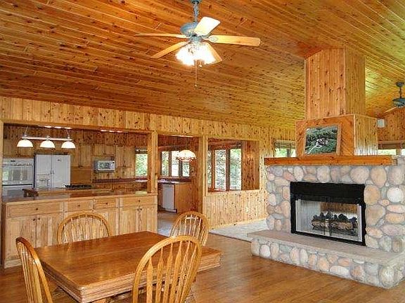 Would you love some land, peace and quiet, and a custom-built rambling ranch? This home features: covered front & back porches; gazebo in back; open-concept living areas w/ 2-sided field stone fireplace, knotty-pine walls & vaulted ceilings, DR w/ doors to sun RM; master suite w/ walk-in closet, & private bath. 24x23 & 24x25 garage bays w/ stairs to basement. Only 4 houses on this private shared road. Up to 6 pets are allowed, including horses. Sorry, no cows, goats, or pigs.