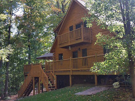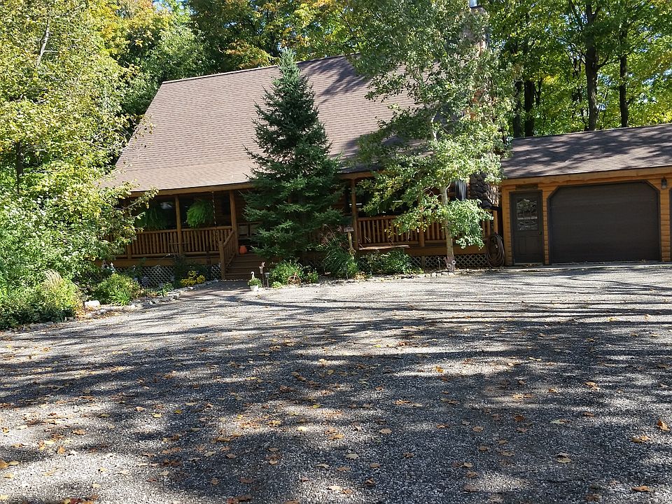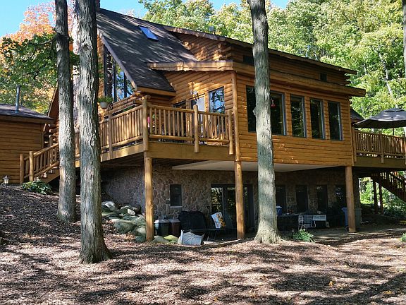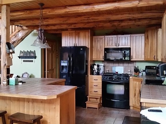 2 story log cabin, 2/3 bedrooms, 3 1/2 bathrooms, main level laundry, central vac, wood burning fireplace, walk out basement, small pool in basement, outside wood burner can heat it all.