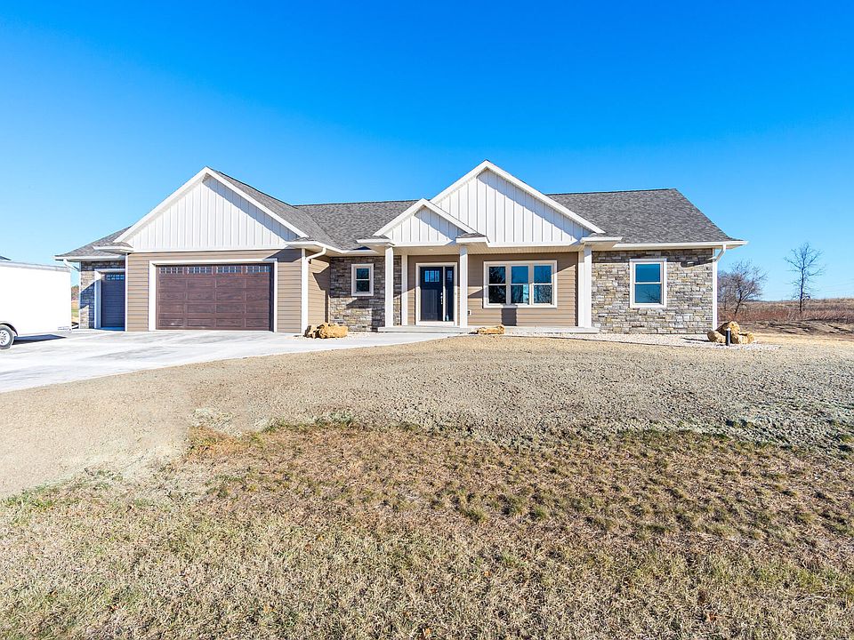 DECEMBER COMPLETION-CHARMING OPEN CONCEPT RANCH W/PLENTY OF CURB APPEAL ON OVER 3/4 ACRE ADJOINING NATURE PRESERVE. WELCOME TO WILDFLOWER TERRACE! YOU WILL APPRECIATE THE SUPER SIZED COVERED PRIVATE PATIO W/CAR SIDING OVERLOOKING THE LARGE LOT & NATURE PRESERVE! FEATURES: FLOWING OPEN FLOOR PLAN, SPLIT MASTER LAYOUT, SPACIOUS/BRIGHT GREAT ROOM, MODERN KITCHEN (MISSION STYLE CABINETS, ISLAND, IMPRESSIVE GRANITE, AMPLE DINING), MASTER SUITE (LG. WALK-IN CLOSET, DUAL VANITY W/GRANITE, CUSTOM WALK-IN SHOWER), CONVENIENT MN FLR LAUNDRY/MUDROOM, STEEL SIDING W/STONE ACCENT, CRAFTSMAN STYLE DOORS/TRIM. THE LOWER IS READY TO FINISH (EGRESS WINDOWS, 2 BR, BATH, REC/THEATER). HUGE 3.5+ CAR GARAGE/SHOP W/ADDED REAR OVERHEAD DOOR. NICE SETTING-SUNSET VIEWS & KIDS WILL LOVE THE PARK/BALLFIELDS!