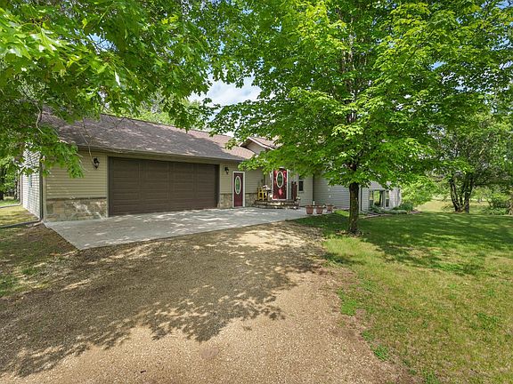 Quiet country home located in private cul-de-sac on a spacious 2 acre lot. Featuring 5 bedrooms, 3 full baths, convenient Kitchen w/new appliances & open Dining/Living Room areas, Fireplace in LR, lots of windows for natural light & great country views. Enjoy vaulted ceilings, Main Bedroom w/walk-in closet & En Suite bath w/whirlpool tub, tiled Bathroom floors, spacious & unique Foyer also has access to garage & back yard patio/deck area. Composite decks overlook back yard areas. Lower level offers large Family room with lower level walk-out to backyard. Oversized attached 2+ car garage will fit 3 cars, has attic storage & access to 7x9 concrete storm shelter. Outside you will love the extra storage in the 26X40 pole shed w/electricity & 10x18 Lean-to. (pole building has 2 garage doors). Updates per seller include: Well pressure tank/water pump, water softener, patio doors & BRAND NEW furnace/AC to be installed prior to closing! Just minutes from Menomonie, Durand, Hudson areas.