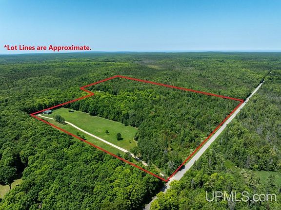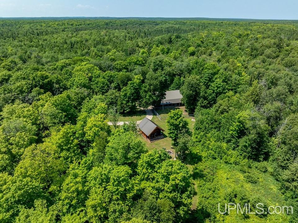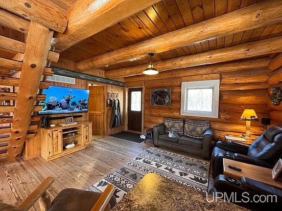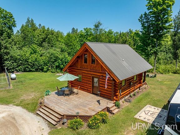 NESTLED WITHIN 36.8 ACRES of serene landscape this property offers a harmonious blend of wooded areas and open fields, creating a private setting that’s both inviting and secluded. British Columbia full log home exudes warmth and charm, providing a small and cozy retreat without compromising on necessities. It’s a smart home equipped with modern amenities for convenience and comfort. High speed internet. Exterior of home was refinished in 2023. Circle drive, horseshoe court, firepit and front & back decks to watch the stars. The garage space has ample storage and space for hobbies. 40x60 garage includes upper level storage, a 20x24 finished, heated workshop, built in dog kennels and fenced in play area. Also an additional 40x44 pole building with storage room, hay loft, it’s own drilled well and livestock waterer. Nature lovers will appreciate the walking trails, and the apple trees add a touch of sweetness! There is so much you can enjoy in every season from this homestead. Snowmobile, ATV, hike, bike, fish, hunt….it’s all here! Minutes from Munising, Pictured Rocks Lakeshore, many inland lakes & streams. And your driveway is just the right distance off a year round paved road. Everything is very well maintained inside and out! Furnishings included! This is a GEM!