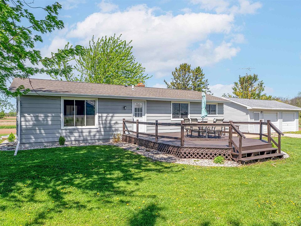 This stunning property spans 5.00+/- acres & features 4 exterior garages that could have a rental income for you! 80x40, 80x30, 70x30 & 160x40 in addition to a two-car detached garage. It has excellent potential for rental income. The home has been completely remodeled & includes a kitchen with impressive Quartz countertops, complete with an appliance package. Enjoy amazing views from the living rm and find 2 bedrooms on the main floor along with a main bath that includes laundry facilities. Additionally, there is a 3rd bedroom in the LL along with another rm for an exercise room or office area and a second-full bath and a family rm. This home and property have many opportunities for you. Property has been Divided into 2 parcels. Home has new Mound System installed this Spring/Summer
